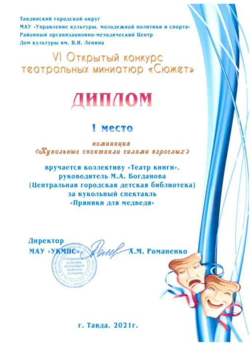 Диплом за 1 место в VI конкурсе театральных миниатюр "Сюжет" в номинации "Кукольные спектакли силами взрослых"