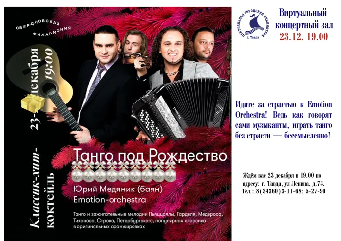 В преддверии Нового года Свердловская филармония дарит слушателям Виртуального концертного зала необыкновенный концерт "Танго под Рождество"! Приглашаем всех желающих окунуться в чарующие звуки танго!. Не упустите возможность насладиться популярными мелодиями, проведите зимний вечер с волшебной музыкой, подарите себе праздник!
