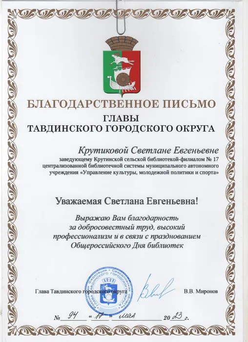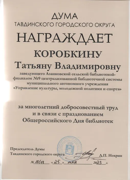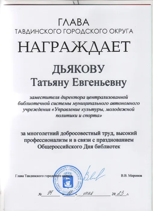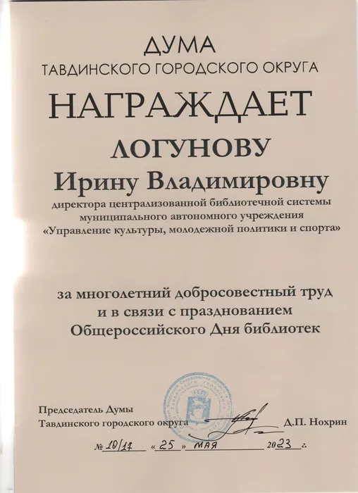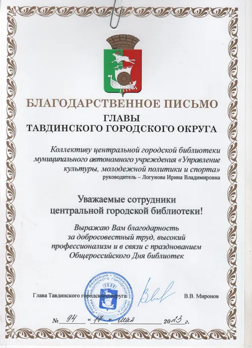 В связи с празднованем Общероссийского дня библиотек сотрудникам Централизованной библиотечной системы вручены Почётные грамоты и Благодарственные письма от Главы администрации и Думы Тавдинского городского городского округа.