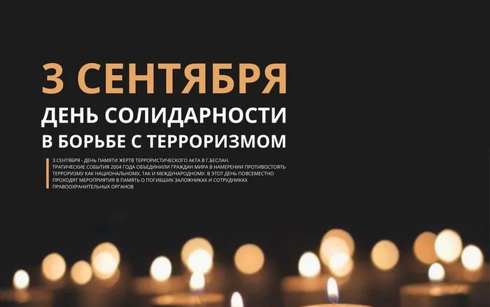 Ежегодно 3 сентября в России отмечается День солидарности в борьбе с терроризмом. Эта памятная дата России была установлена в 2005 году федеральным законом «О днях воинской славы России» и связана с трагическими событиями в Беслане (Северная Осетия, 1—3 сентября 2004 года), когда боевики захватили одну из городских школ. В результате теракта в школе № 1 погибли более трехсот человек, среди них более 150 детей. В этот день также вспоминают жертв других терактов, произошедших в разных точках России: захвата в заложники жителей Буденновска в 1995 году, взрыва на Центральном рынке во Владикавказе в 1999 году, теракта на Дубровке в 2002-м, взрывов самолетов над Ростовской и Тульской областями в 2004 году и другие трагедии. Теракт в московском концертном зале «Крокус Сити Холл», который произошел 22 марта 2024 года, стал самым смертоносным в России после трагедии в Беслане. Его жертвами, по последним данным, стали 145 человек, свыше 550 пострадали.