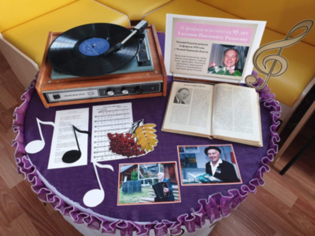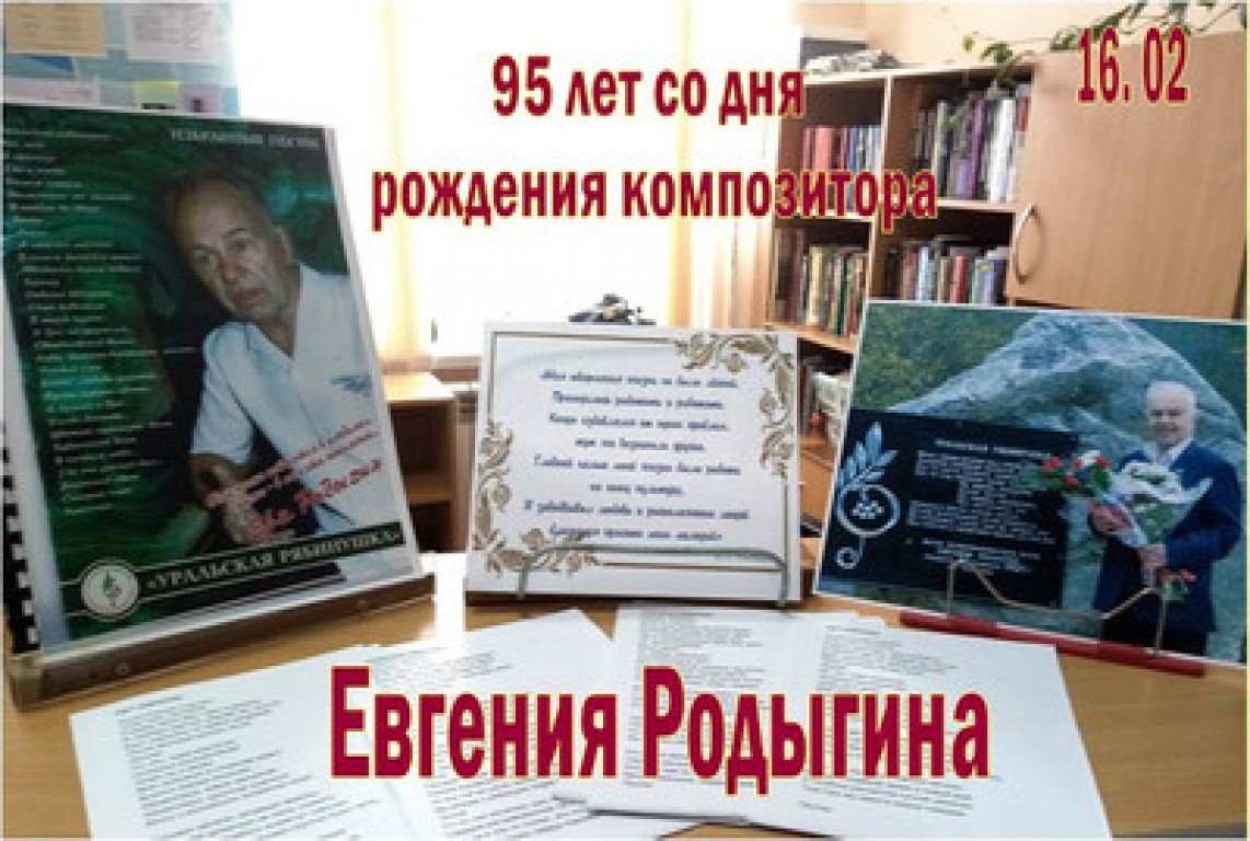 Центральная городская детская библиотека приглашает посетить выставку-экспозицию, посвященную знаменитому композитору, на которой представлены книги, фотографии Евгения Павловича Родыгина, запечатлевшего его на сцене и в жизни, а также с помощью проигрывателя можно прослушать запись песни "Уральская рябинушка". Выставка работает на старшем абонементе.